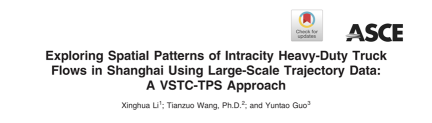 国际著名学术期刊《Journal of Transportation Engineering, Part A: Systems》2025年11月在线发表了我院学者牵头完成的论文《基于大规模轨迹数据的上海市内重型货车运输特征研究:一种基于轨迹点序列时空聚类的方法》(Exploring Spatial Patterns of Intracity Heavy-Duty Truck Flows in Shanghai Using Large-Scale Trajectory Data: A VSTC-TPS Approach)。论文由同济大学李兴华教授、公安部道路交通安全研究中心王天佐博士、同济大学郭赟韬副教授共同完成。